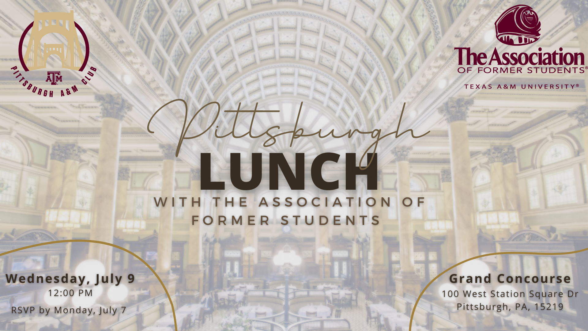 The Association of Former Students’ Club Programs team is visiting the Northeast U.S. A&M clubs this summer, and Pittsburgh is on the list! Join us for a casual lunch to connect with fellow Aggies and welcome our visitors from the Association