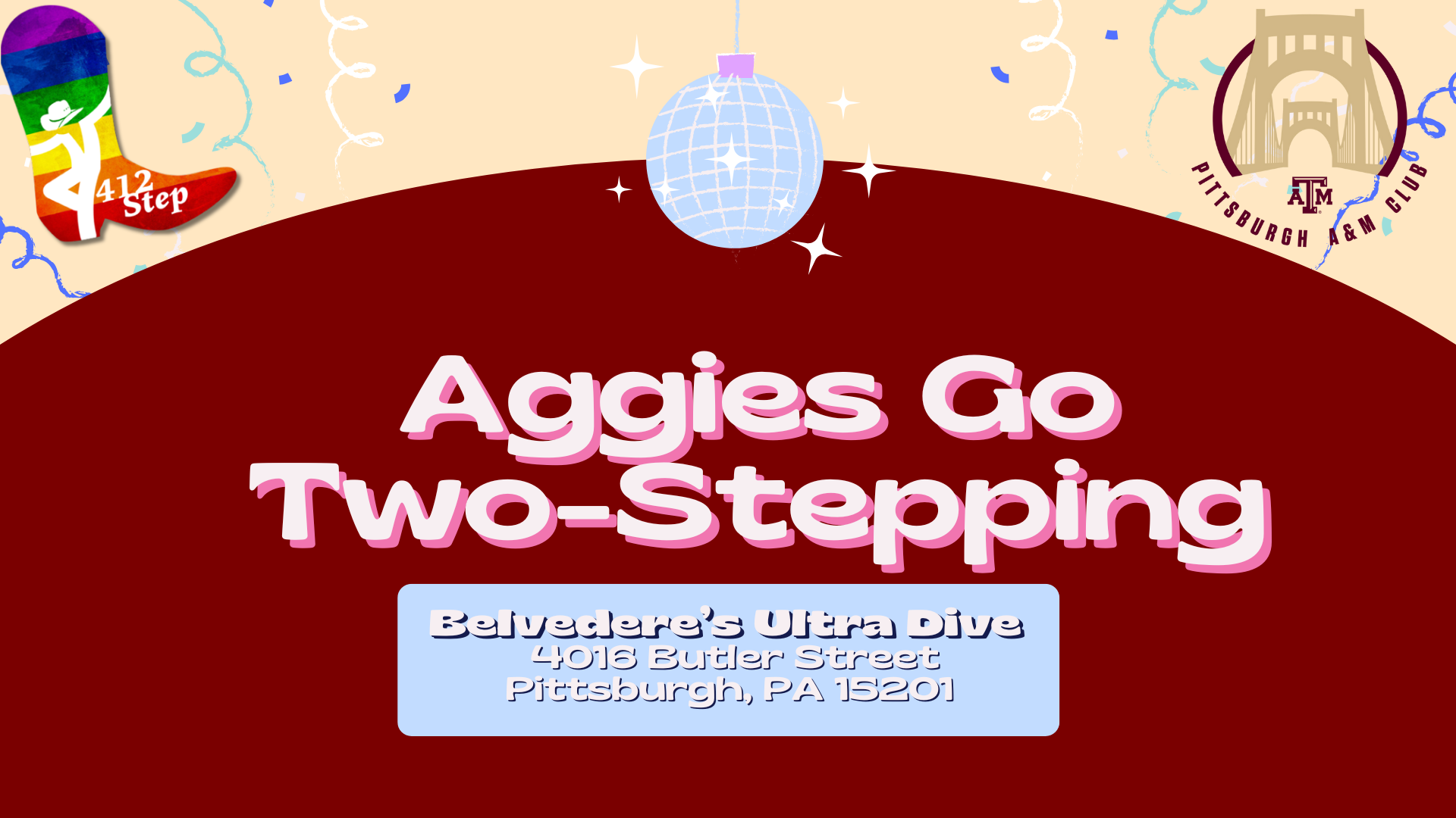 Belvedere’s Ultra-Dive 4016 Butler St Pittsburgh, PA 15201, Pittsburgh, PAThe Pittsburgh A&M Club will be heading to 412Step's Welcome Weeks on the first Wednesday of each month! These special nights are led by 412Step, Pittsburgh’s all-inclusive line dancing, waltzing, and two-stepping community. Every Wednesday, 412Step hosts dance nights at Belve’s in Lawrenceville. Their “Welcome Week” dances are perfect for newcomers (or for Aggies brushing […]